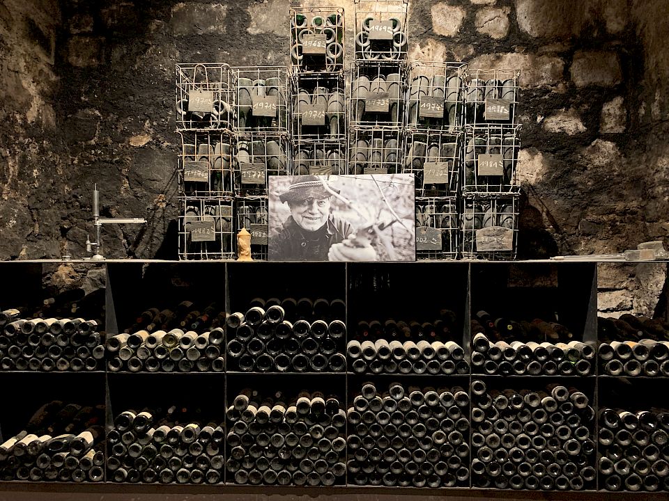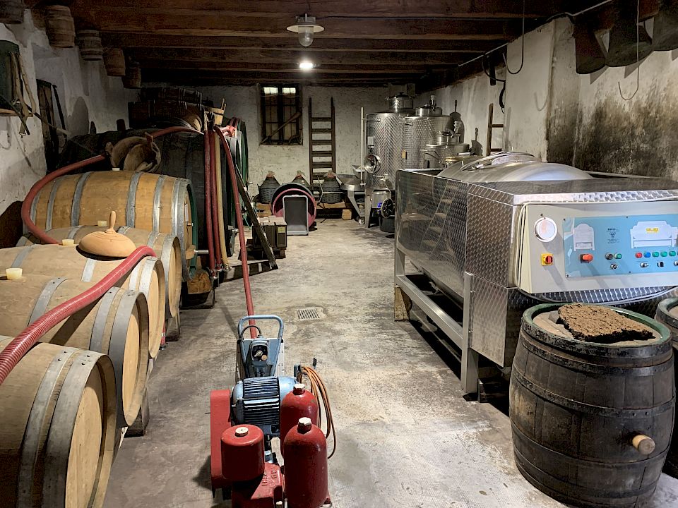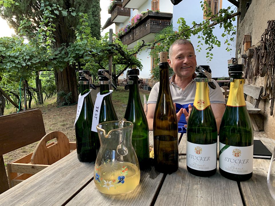 Sigmar "Guggi" Stocker empfängt uns lässig mit königsblauem Schurz und Schlapphut. Der Sohn des legendären Terlaner Kellermeisters Sebastian Stocker führt ehrfürchtig das Sektgut des Vaters weiter. Man könnte es durchaus als Garage-Winery bezeichnen, wo mit viel Leidenschaft an der Fortführung der 1963 begonnenen Sektproduktion getüftelt wird. Wunderschön, linear, still und zeitlos ist der neue Keller, wo die Flaschen auf den Pupitres ruhen, gekrönt von einer eigenes angefertigen Uhr, die die 12 Monate laut Reimmichl darstellt. Alles braucht seine Zeit - Alles hat seine Zeit. Hier findet man so manche Rarität aus Terlaner Landen, vor allem den Weiss Terlaner, eine eigene Rebsorte. Sie ist kein Hermaphrodit wie andere Rebsorten und braucht somit eine männliche Rebe, die die Weibchen bestäubt. Von ihr gibt es in Terlan nur mehr ein paar Rebzeilen, die meisten nennt Stocker sein Eigentum. Die klassische Terlaner Cuvée aus Chardonnay, Weißburgunder und Sauvignon hat mit ihr nichts zu tun. Just so you know. Der Geschmack von Weiss Terlaner erinnert im Nachhall dezent an Fragolino, ist frisch und sehr fruchtbetont und kann - auch laut alten Überlieferungen - gut altern. Guggi möchte Weiss Terlaner versekten: "Mal schauen, was dabei rauskommt". In der Zwischenzeit tüftelt er an einem sehr spannenden Sauvignon Sekt, zusätzlichen zu seinem Brut und seinem Natur (bewusst ohne "e" geschrieben), jeweils aus Chardonnay, Weißburgunder und Sauvignon. So wie es sich für einen waschechten Terlaner gehört.